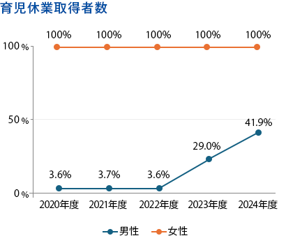 当社では、出産・育児と仕事を両立できる環境づくりに取り組み、女性の育児休業取得率・復職率は100%を継続しています。近年は男性の育児参加も進み、男性の育児休業取得率は40%を超えるまでに拡大しました。